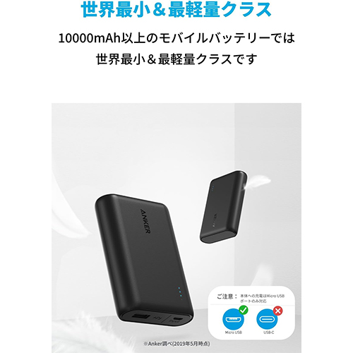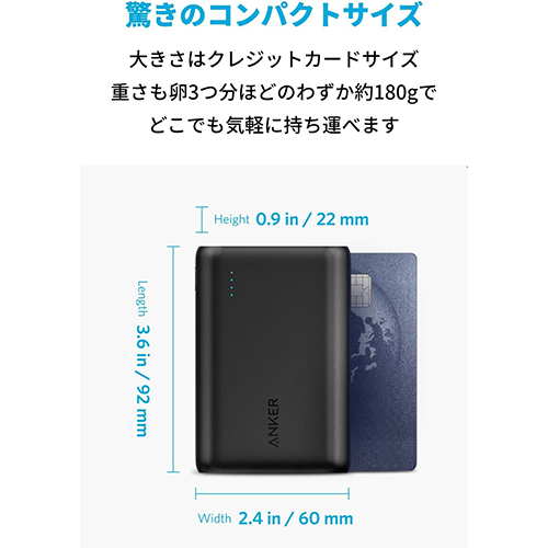 10000mAh以上のモバイルバッテリーでは、世界最小&最軽量 (※2019年5月時点) 。大きさはクレジットカードサイズほどしかなく、重さも卵3つ分ほどのわずか約180g。いつでもどこでも気軽に持ち運べます。