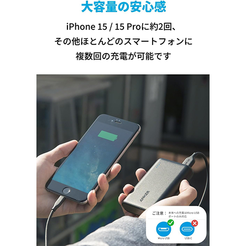 iPhone 15に約2回、iPad mini 5に約1.3回、その他ほとんどのスマートフォンに複数回の充電が可能です (充電回数はAnker調べ) 。より早い充電技術 - Anker独自技術PowerIQとVoltageBoostにより、お使いのすべての機器に対し、最大2.4Aでフルスピード充電が可能です。