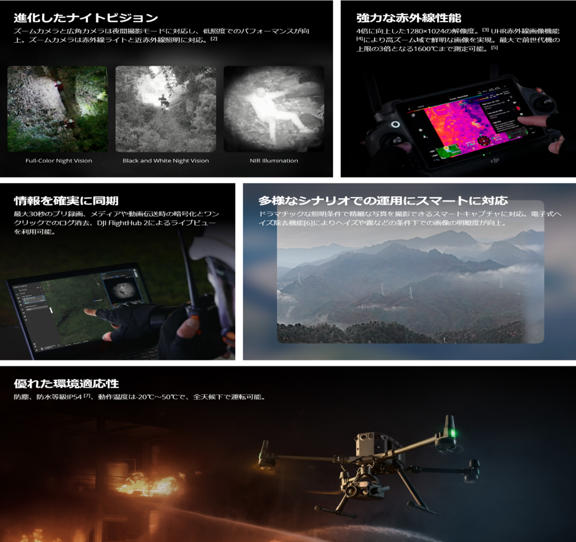 DJI Zenmuseはペイロードの可能性を押し広げ、より遠距離からでも細部まで鮮明に捉え、より正確な角度で、昼夜を問わず映像を撮影できる。全天候型マルチセンサー対応ドローン向けペイロードです。